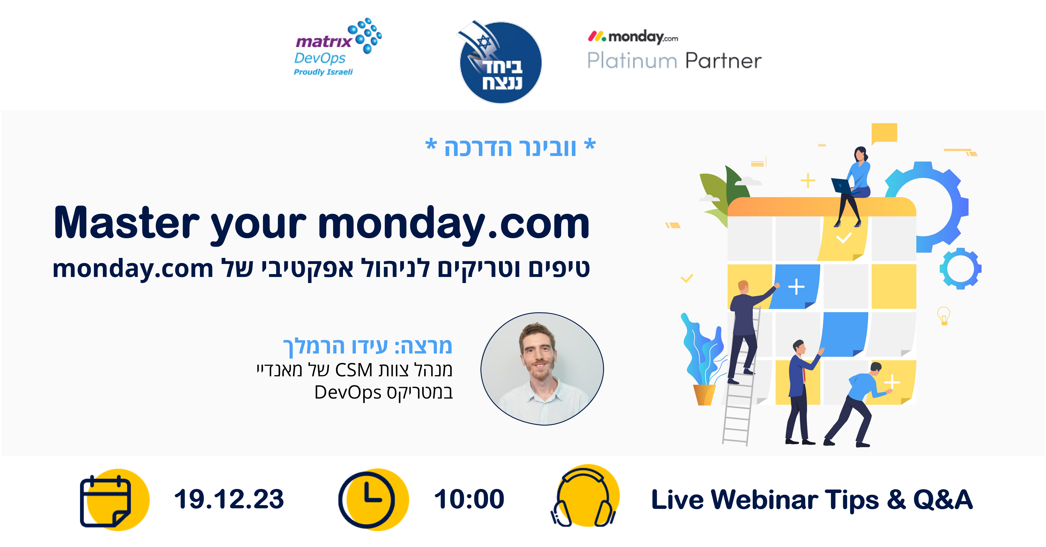 הצטרפו לוובינר בנושא ניהול ובקרה על תכניות עבודה, בוובינר נדבר על איך מגבירים את יכולת הביצוע באמצעות מתדולוגיה ומערכת monday.com