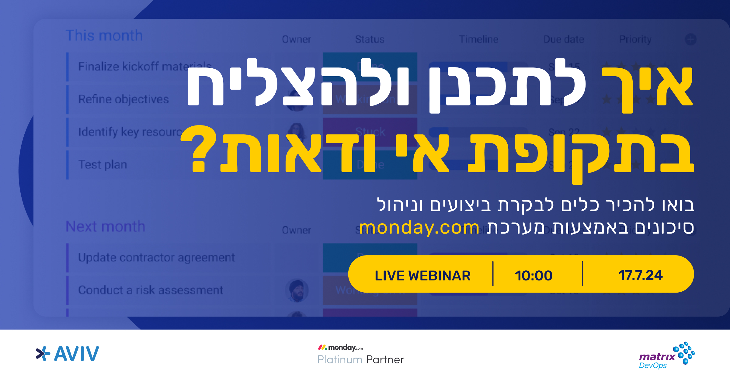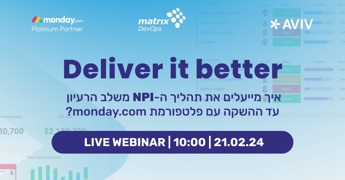 הצטרפו לוובינר ייחודי שבו נציג מתודולגיה וכלים למעקב וניהול ביצועים. נלמד כיצד ניתן להשתמש בפלטפורמת monday.com להגדלת הפרודוקטיביות, ניהול סיכונים, ושיפור קבלת ההחלטות בארגון.