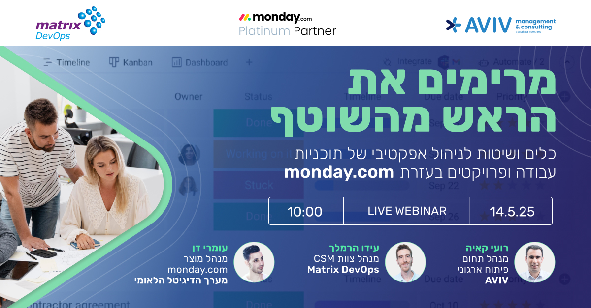 בוובינר הקרוב, בשיתוף monday.com נציג מתודולוגיות לניהול תוכניות עבודה ופורטפוליו פרויקטים, ונדגים כיצד ניתן ליישם אותן באופן פרקטי בעזרת הפלטפורמה של monday.com ככלי עבודה יומיומי למנהלים.