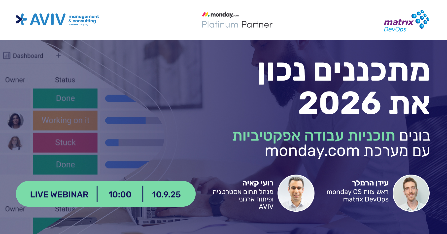 בוובינר הקרוב נלמד איך לבנות תוכנית עבודה אפקטיבית ומדויקת לשנת 2026, כזו שמספקת לארגון מסגרת פעולה ברורה, מצמצמת סיכונים ומאפשרת לצוותים להישאר ממוקדים גם כשדברים משתנים. נציג מתודולוגיה סדורה לבניית תוכניות ונראה איך ניתן ליישם אותה בפשטות וביעילות באמצעות monday.com ככלי ניהולי מוביל.
